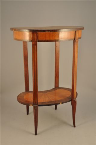 TABLE de salon dîte "rognon" en bois de placage teinté, ouvrant à un tiroir en ceinture, la plateau et l'entretoise à décor marqueté rayonnant.