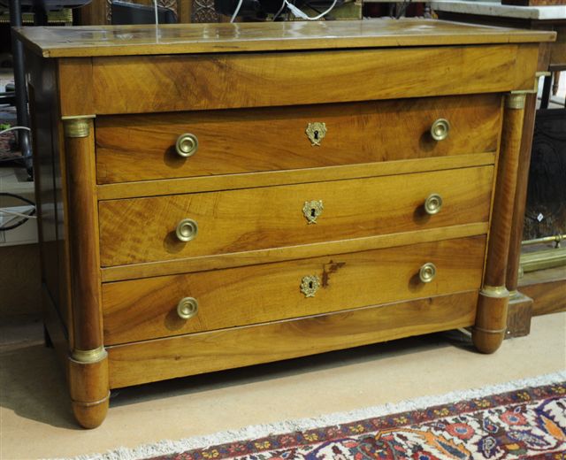 COMMODE en noyer ouvrant à quatre tiroirs dont un simulé, à colonnes semi-engagées. Ornementation de bronze pour les poignées de tirage, les entrées de serrure à décor de cornes d'abondance et les chapiteaux.
