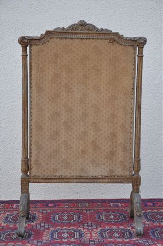 ECRAN de cheminée en bois mouluré et sculpté, relaqué gris. Les pieds mouvementés, les montants en colonne détachée cannelée, dés de raccordement ornés de rosaces. Frise de raies de coeur sur les traverses. Feuilles d'acanthe sculptée à la base des montants et sur la traverse supérieure.