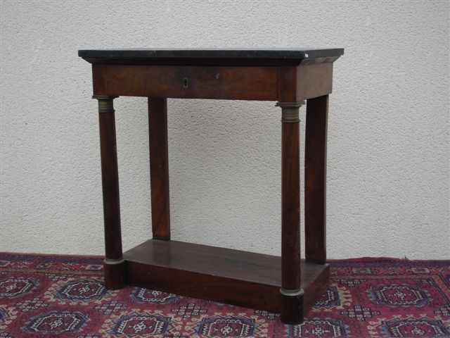 CONSOLE en acajou et placage d'acajou sur plinthe, ouvrant à un tiroir en ceinture. Les montants antérieurs en colonne baguées de bronze à motifs de frise florale. Les montants postérieurs en pilastre. Dessus de marbre granité belge.