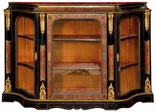 MEUBLE d'ENTRE DEUX en bois noirci et marqueterie dite Boulle. Il ouvre par trois portes vitrées en façade dont deux galbées, sur fond d'écaille rouge. Ornementation de bronze doré aux entrées de serrure, frise d'oves à la traverse basse, feuilles d'acanthe sur les montants.