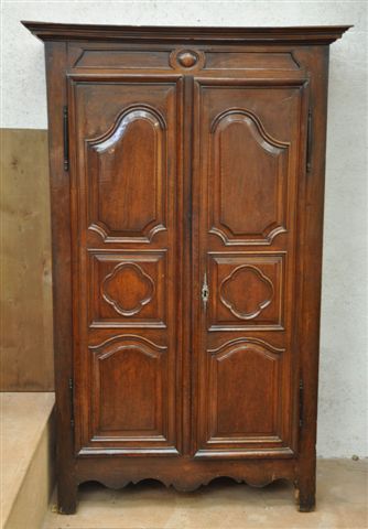ARMOIRE en noyer mouluré ouvrant à deux battants ornés de trois compartiments moulurés. Surmontée d'une corniche à gradins inversés et ornée d'une ceinture mouvementée, elle repose sur quatre petits pieds. Fiches et entrées de serrure en fer.