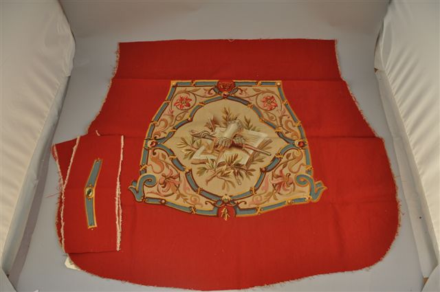 GARNITURE d'assise de siège et de paire de manchettes à motif incurvé en tapisserie d'AUBUSSON. Décor d'un trophée d'armes et de rinceaux de fleur, sur fond beige, dans des réserves délimités par des entrelacs. Entourage de couleur rouge. Laine et soie.