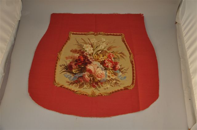 GARNITURE d'assise de siège en tapisserie d'AUBUSSON. Décor d'une composition de fleurs nouées d'un ruban bleu "L'Avare", sur fond beige. Oves et feuilles formant le cadre. Entourage de couleur rouge. Laine et soie. Style Louis XV. Dim. du motif : 49 x 54 cm. Dim. hors tout : 76 x 86 cm.