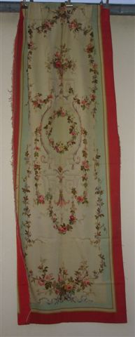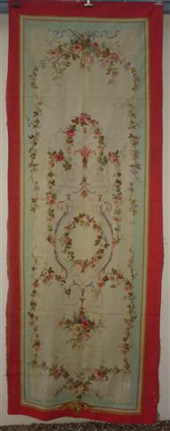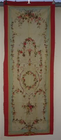 Suite de quatre TENTURES en tapisserie d' AUBUSSON. Décor de guirlandes de fleurs suspendues à un motif central de grecques sur fond beige. Bordure turquoise et entourage rouge vermillon. Noeuds de ruban. Laine et soie. Fin XIXème. Haut. 315, Larg. 120 cm(petites usures)