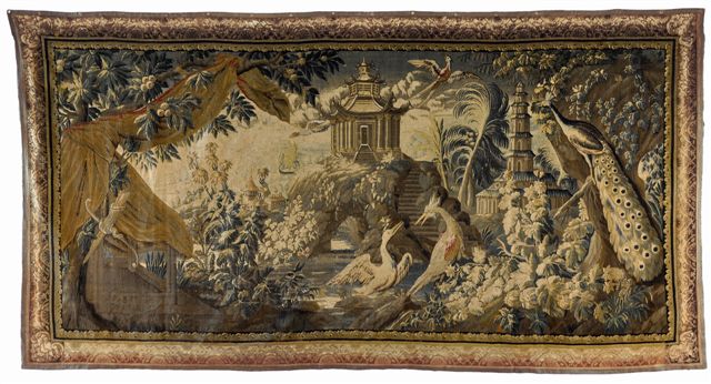 Grande et belle TAPISSERIE D'AUBUSSON. D'après PILLEMENT. Verdure au kiosque et à la pagode dans une perspective paysagée au promontoire rocheux. Au premier plan, drapé à l'arc et au carquois de flèches, et quatre volatiles dont un paon. Bordure simulant un cadre doré.