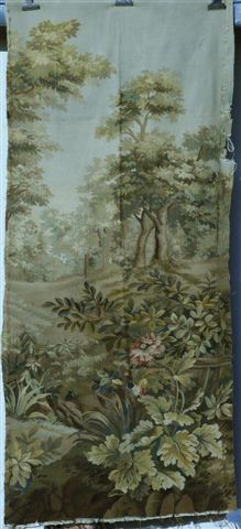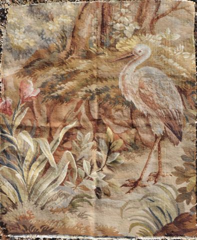 Deux FRAGMENTS de TAPISSERIE d'AUBUSSON représentant des verdures , l'une avec un échassier. Laine et soie. XIXème. 200 x 88 et 87 x 74 cm.