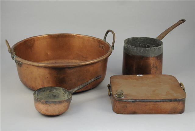 LOT en cuivre comprenant une BASSINE à confitures, deux CASSEROLES et une BOUILLOTTE rectangulaire à anses latérales.