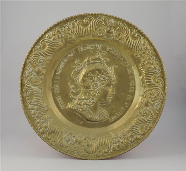 Grand PLAT circulaire en laiton repoussé "Offert par la Manufacture Française d'Armes et de Cycles de St Etienne". L'aile à motifs de cornes d'abondance alternées de pots à feux. Le bassin au profil d'une femme casquée à la chimère. Diam. 62 cm