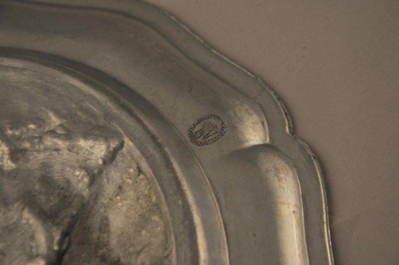 Paire d'ASSIETTES en étain à bords contournés, martellées au centre de reproduction de tableaux du Louvre : la "Dentelière" par Vermeer et les "Changeurs" par Metsys. Marque à l'ange.