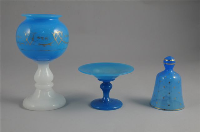 LOT comprenant un BAGUIER et une CLOCHETTE de table en verre opalin bleu, la clochette à semis d'étoiles or, et une VEILLEUSE sphérique en verre opalin bleu, sur pied en verre opalin blanc, rehaussée de motifs peints à l'or.