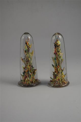PAIRE de PRESSE-PAPIERS en verre, de forme conique, modelés à chaud, polychromie en inclusion. Haut. 14,5 cm.