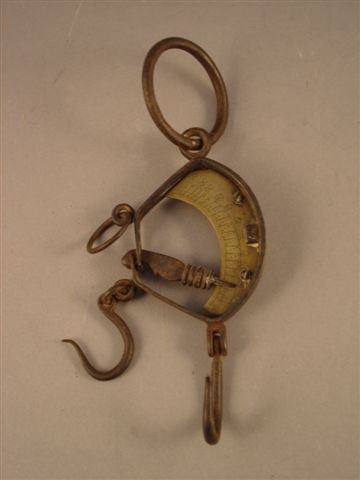 PESON de forme trapézoïdale en acier forgé et laiton comprenant une attache en forme d'anneau, un cadran double à deux faces graduées, deux crochets et portant le nom du fabricant : "HERRETZ". XIXème siècle.