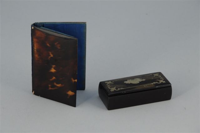 LOT comprenant une BOITE rectangulaire en écaille, le couvercle et les cotés légèrement bombés. Le couvercle incruté d'un motif central dans un encadrement, d'inspiration Rocaille (Haut. 2,5, Long. 10, Larg. 4 cm) et un CARNET de BAL, les plats bombés en écaille (11 x 7, 5 cm). XIXème.