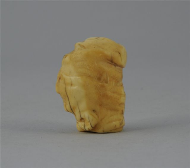 POMMEAU de CANNE en ivoire sculpté figurant une tête encapuchonnée, couverte sur un profil, allégorie de la nature humaine (?). Haut. 4,5 cm.