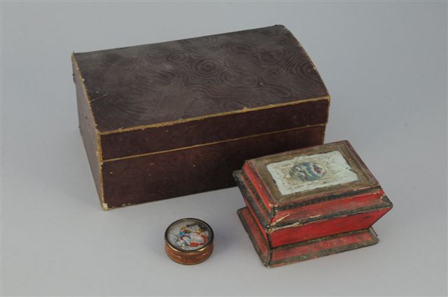LOT comprenant trois BOITES en cartonnage, la première ronde à couvercle en fixé sous verre, la seconde rectangulaire en forme de malle, la troisième à couvercle orné d'une image pieuse (accidents)