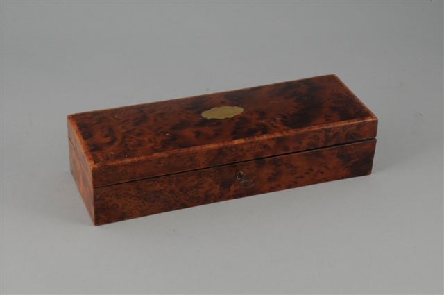 BOITE à GANTS en placage de bois ronceux et bois de rose. Le couvercle à charnières, légèrement bombé, incrusté au centre d'un cartouche en laiton (non monogrammé). Seconde moitié du XIXème. Haut. 8, Long. 32, Prof. 11 cm.