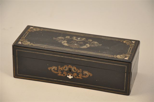 BOÎTE à GANT rectangulaire en placage de bois noirci, incrusté de nacre, décor de rinceaux et monogrammé " M. B.", l'intérieur marqueté de filets en ivoire. Marqué "Alph Giroux à Paris" sur la charnière. (manque au placage, sans la clé) Haut.8,5, Larg. 26, Prof. 10 cm.