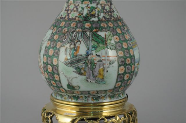LAMPE A PETROLE. Porcelaine chinoise, verre, bronze.