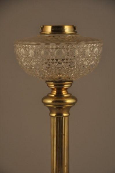 LAMPE À HUILE SUR COLONNE en bronze doré et verre moulé en cabochon par la maison "EVERED & CO LP" (manques).