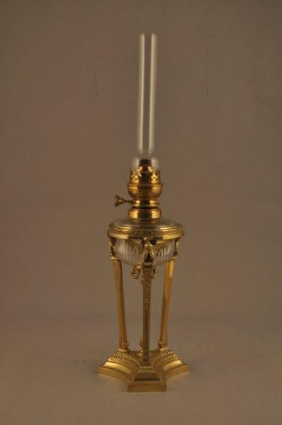 LAMPE À HUILE "MATADOR 15" en bronze et cristal taillé, en forme de réchaud à l'athénienne reposant sur trois colonnes surmontées d'un aigle aux ailes déployées réunies par un cul de lampe en chute et reposant sur un socle triangulaire orné d'une double frises perlée et de feuilles d'eau entourant un pomme de pin. Bouton et réservoir de laiton marqué "*** / MATADOR / 15''' ".