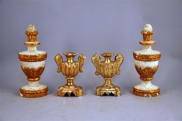 LOT de QUATRE VASES en bois sculpté. Les deux premiers d'applique en bois doré de forme balustre, sur une base quadrangulaire à pans coupés, corps à godrons verticaux, anses latérales en volutes. Les deux seconds formant paire, toutes faces, redoré et laqué blanc, de forme balustre à motifs de feuilles stylisées et rang de perles.
