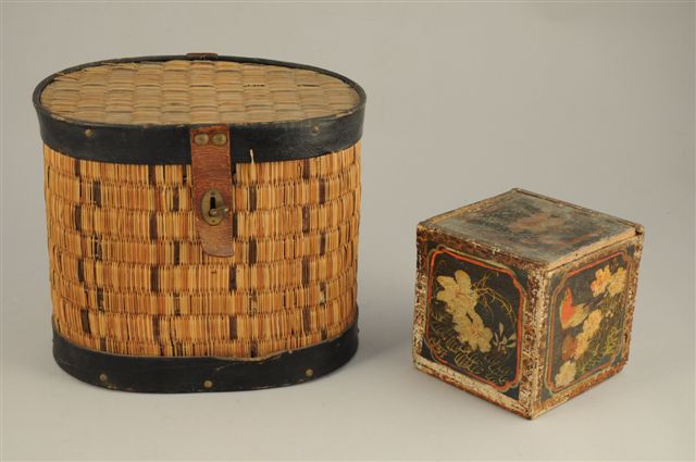 BOITE à thé "Thé noir Sio-Fa-Fun Tercia, spécialement récolté et préparé pour la Maison du Bon Marché, Paris Hankow", de forme cubique en bois appliquée de papier peint de fleurs, dessus coulissant, HUIT FLEURS composées de pétales de nacre peints, un mètre ruban gainé de cuir (manque), un yo-yo.