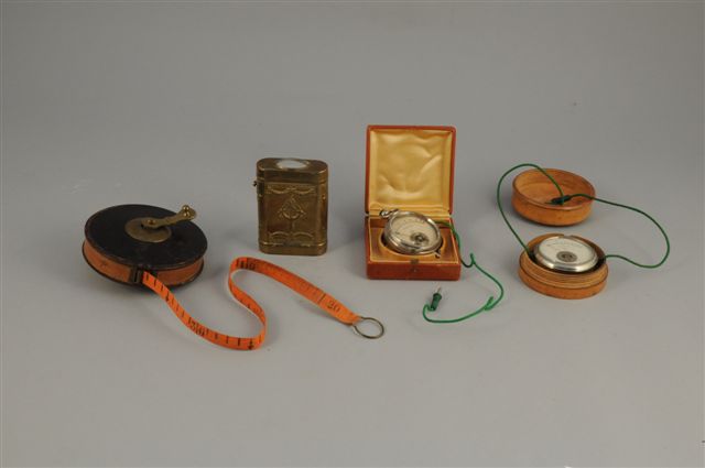 LOT comprenant deux VOLTMÈTRES, l'un dans une boîte en bois, l'autre dans un écrin, une LAMPE de POCHE en laiton repoussé à décor de couronnes et guirlandes de lauriers. 10 x 6 cm. METRE-RUBAN en cuir et laiton d'une longueur totale de 20 m.