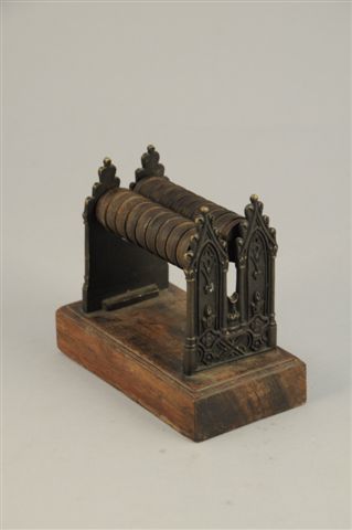 MATRICE de gaufrage (?) composées de deux cylindres rayés, supportés par deux montants en bronze en fenestrage ogival, de style gothique. Socle en bois. Haut. totale : 10,5, Long. des cylindres : 7,5 cm.