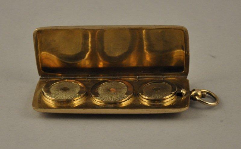 PORTE LOUIS PENDENTIF en métal doré effet martelé, de forme rectangulaire. Couvercle monté à charnière ressort. Trois logements pour pièces de 10 et 20 F. 10 x 3,5 cm