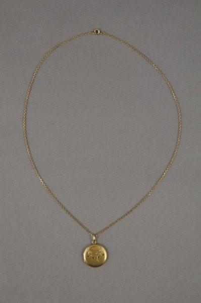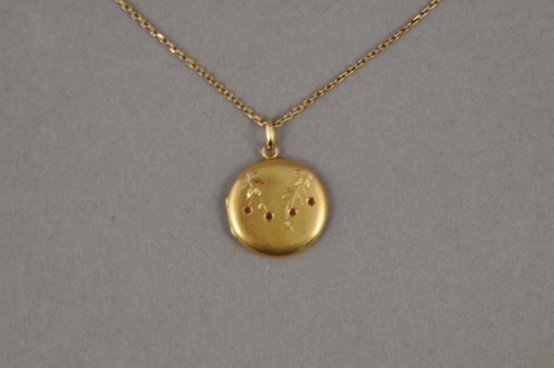 PENDENTIF PORTE PHOTO circulaire en or, gravé sur une face de branches fleuries, sertie de pierres de couleur rouge. Avec chaine maille forçat. Poids brut : 8,5 g. Long. de la chaîne : 51 cm.