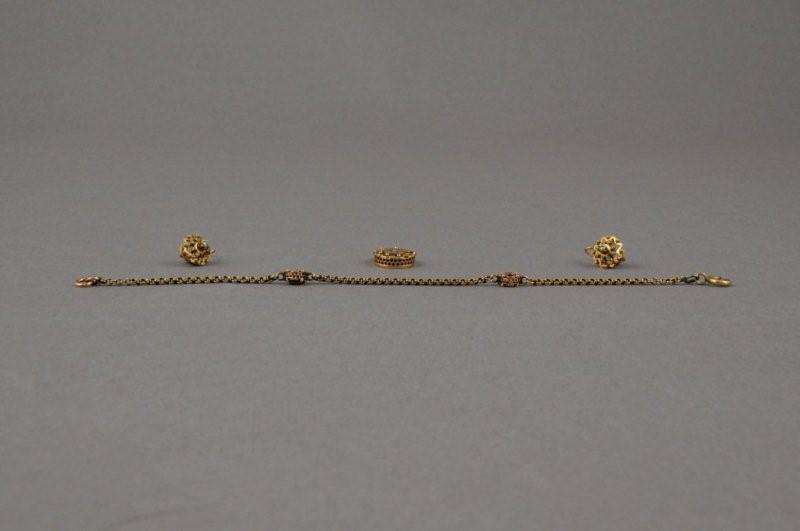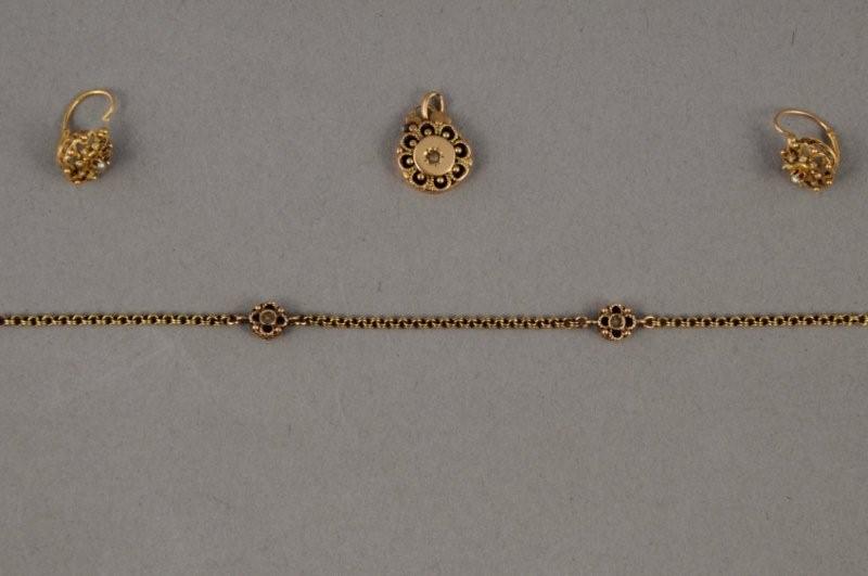 LOT en or comprenant une paire de PENDANTS d'OREILLES "Rosace" ornée de demi-perles (manques), un PENDENTIF en fleur stylisée, un BRACELET, maille forçat double, orné de deux motifs en quatre feuille (restauration). XIXème. Poids total brut : 7,3 g.