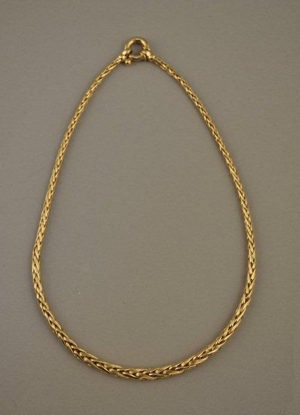 COLLIER en or jaune, maille palmier en chute, en or brillant et strié en alternance. Poids : 23,5 g. Long. 45 cm.