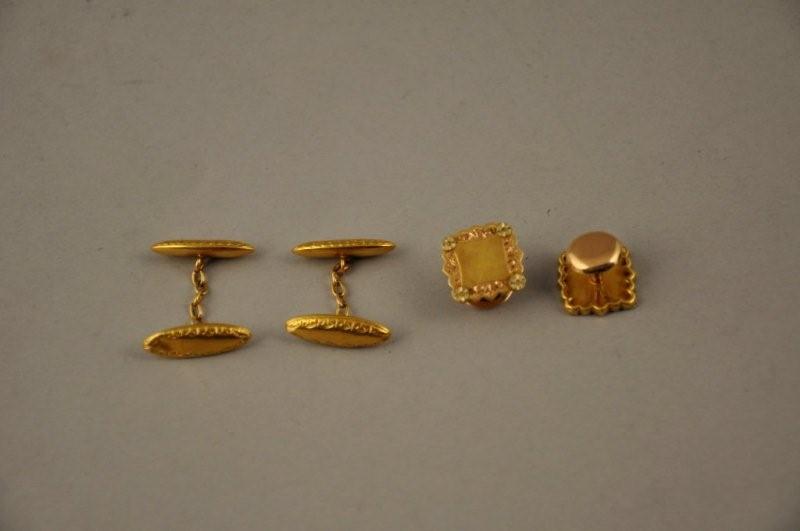 DEUX PAIRES de BOUTONS de MANCHETTES en or. La première de forme oblongue (chocs), la seconde de forme carrée en or de deux tons gravé. Poids total : 7 g.