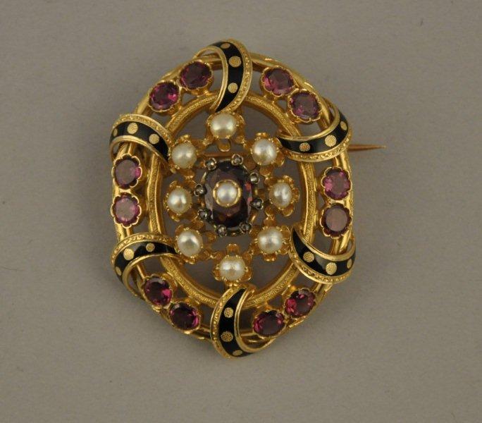 BROCHE ovale en or jaune ajouré, partiellement émaillée noir, ornée de demi-perles et améthystes. XIXème. Poids brut : 21 g.