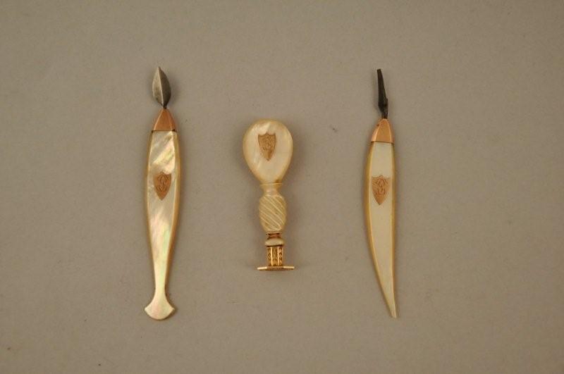 LOT comprenant un SCEAU à cacheter en nacre à matrice à pans coupés en or, monogrammée PE. (Haut. 7 cm). TAILLE-PLUME et OUVRE-LETTRE en nacre et métal doré (Long. 11,5 cm). XIXème. (manque la pointe de la lame du taille plume).