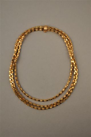 COLLIER en or jaune à 3 rangs, maille agrafes. Poids 74 g.