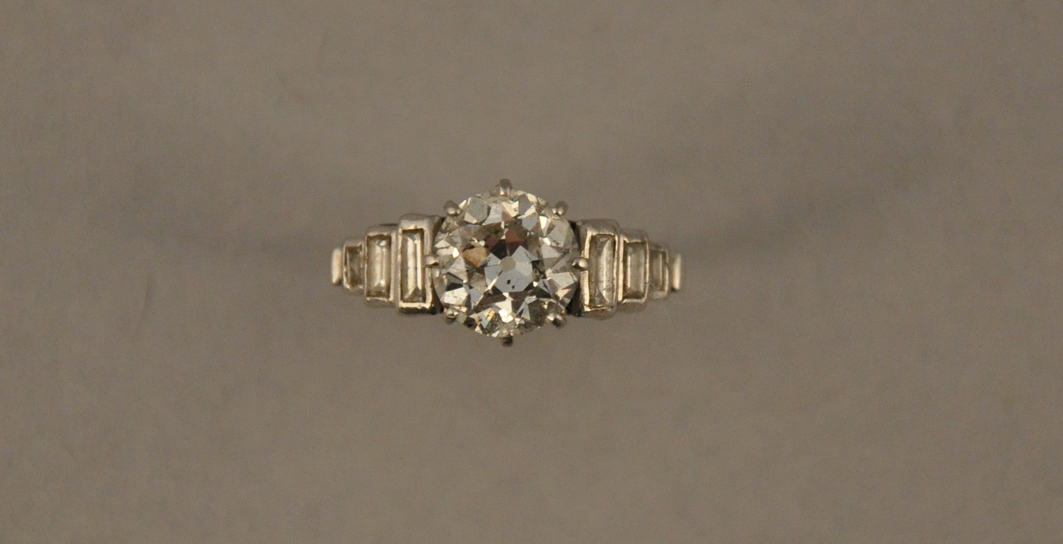 BAGUE en platine ornée d'un diamant brillant, taille ancienne d'environ 1,80 carat. Entourée de 6 diamants-baguettes. Poids 4,3 g.
