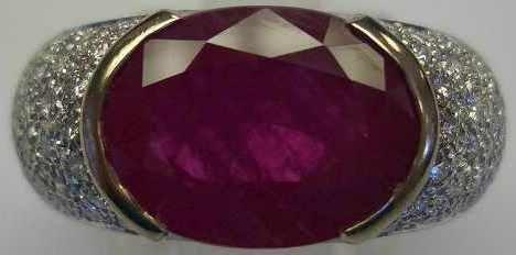 BAGUE Jonc en or blanc ornée d'un rubis d'environ 7,20 carats épaulé d'un pavage de 56 diamants de taille moderne d'environ 0,5 carats au total. Poids brut : 11,45 g.