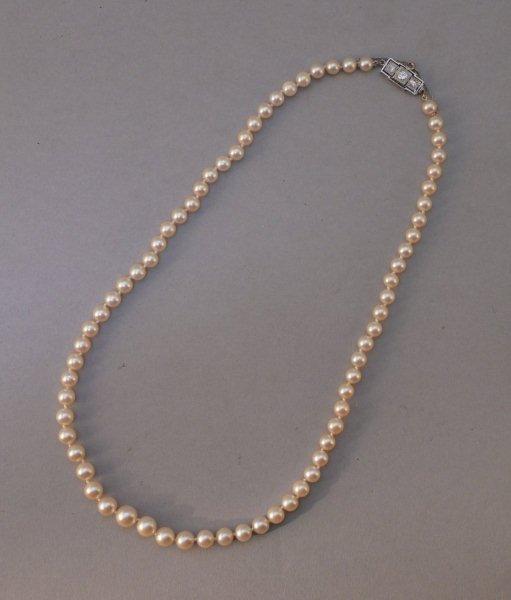 COLLIER de soixante neuf perles de culture en légère chute, le fermoir en or gris serti de trois diamants ronds en ligne.