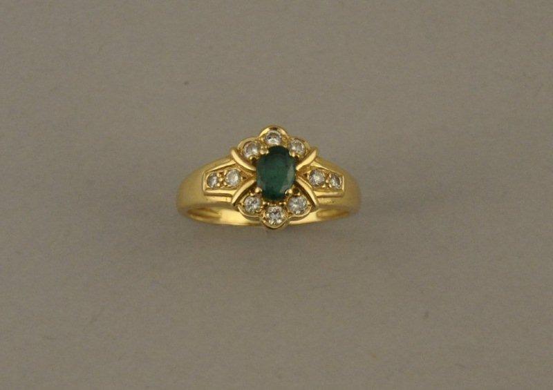 BAGUE en or jaune ornée d'une émeraude ovale en serti griffes, dans un entourage de 9 brillants. Poids : 3,1 g.