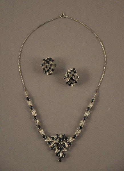 Petite PARURE en argent, sertie de saphirs ronds ou ovales facettés et pierre blanches d'imitation. Elle comprend : un collier articulé et une paire de boucles d'oreilles à système à pinces.