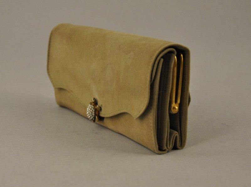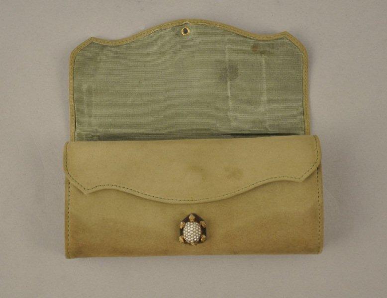 PORTEFEUILLE de couleur vert olive. Le fermoir en argent doré représentant une tortue, la carapace ornée de demi perles fines, yeux sertis de pierres de couleur vertes. Intérieur en tissu moiré et en peau. Miroir. Marqué "Maquet Fils, 19, avenue de l'Opéra, Paris". Replié : 14,5 x 6,5 cm.