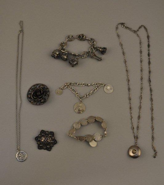 LOT en argent comprenant PENDENTIF " Sombrero", gravé , avec chaîne et élément de chaîne à maillons allongés entrelacés (Poids : 19,5 g), BRACELET "Breloques" à larges maillons retenant 5 breloques, certaines ornées de pierres de couleur (poids brut : 41,1 g), BRACELET composé de 11 pièces de 50 centimes en argent (de 1895 à 1918, poids total : 30,5 g), BRACELET à maille alternée retenant trois médailles en métal ou argent (Poids brut : 29,4 g.), BROCHE ronde "Roses" (poids : 18,3 g), BROCHE "Etoile" à cinq branches en argent (?), pouvant former pendentif (poids : 10,5 g). CHAINE et MEDAILLE "St Christophe", la chaîne à maille forçat lapidée (poids : 13,6 g). Poids brut total : 163,6 g.