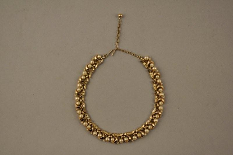 COLLIER fantaisie en métal doré orné de perles nacrée et strass. TRIFARI