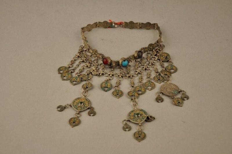 COLLIER en métal partiellement émaillé à pendentifs stylisés, orné de trois cabochons. Travail d'Afrique du Nord.