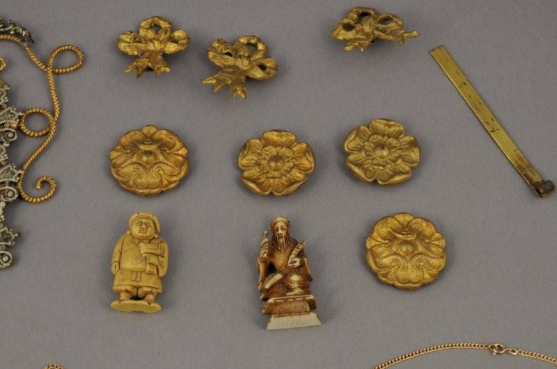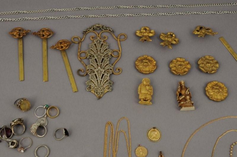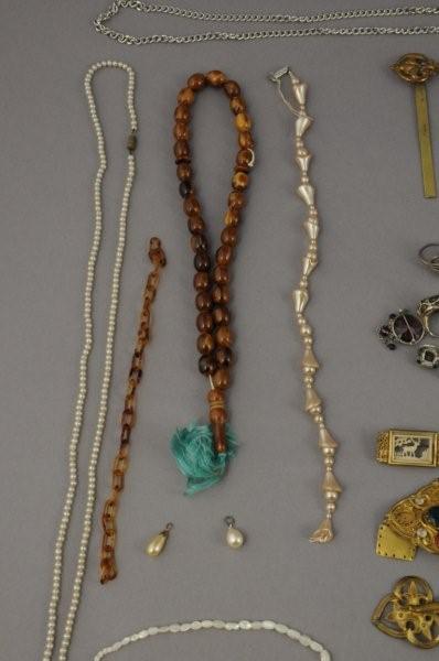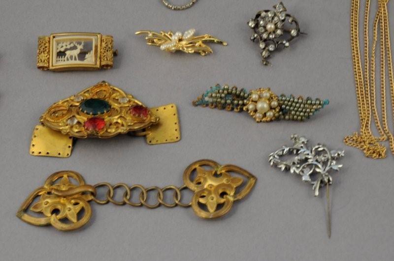 LOT de bijoux en métal doré et fantaisie : COLLIERS, BAGUES, BROCHES, BOUCLE de CAPE, BRACELETS.
