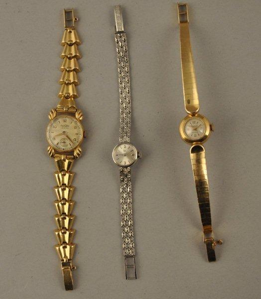 LOT de trois MONTRES- BRACELETS de dame à boitiers et bracelets articulés en or. La première HERODIA, trotteuse à six heures, le bracelet à motifs triangulaires. La seconde FLAMOR. La troisième en or blanc LIP. Poids total brut : 67,2 g.