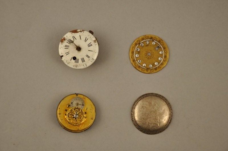 Joint : Fond de boitier de montre en argent, poinçon Minerve. Poids : 10 g. Cadran en métal doré repoussé, partiellement émaillé. XIXème (accidents et manques)