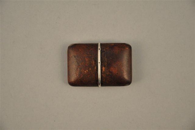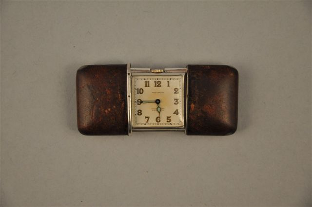 MONTRE GOUSSET, de forme rectangulaire, à pochette coulissante recouverte de cuir. Argent anglais, mouvement suisse, signé MOVADO. Années 1930.